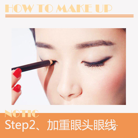 內雙眼睛在睜開后,眼角睫毛根部眼線會被眼皮褶皺遮蓋,所以眼角眼線要特別加重,寬度也比眼睛中間部分的眼線略寬。