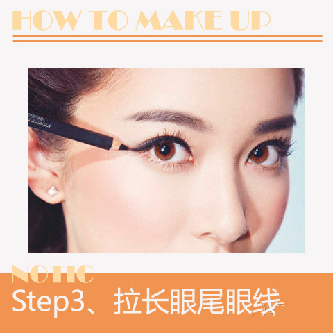 用眼線筆順著睫毛的根部將眼尾處的眼線平行拉長,拉伸長度根據眼形的不同,可在1~2mm之間進行調整。然后,從眼線上邊緣自然過渡至尾端。