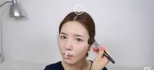 第五步打陰影。用棕色的陰影粉打在耳根到下巴的連線上。把嘴嘟成“魚嘴型”,在顴骨下方凹進去的部分掃上陰影粉。