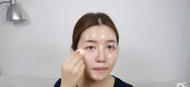 第二步涂粉底。將粉底點在全臉,用海綿均勻涂開。