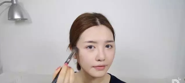 第七步打鼻影。用棕色的眼影棒涂在眉頭,然后用刷子向下掃開,一直刷到鼻頭,自然暈開。
