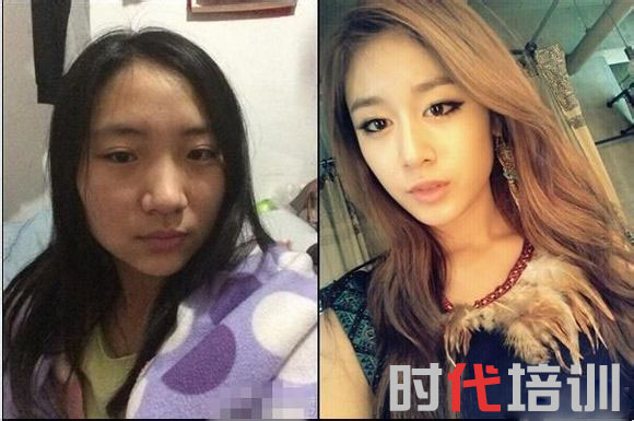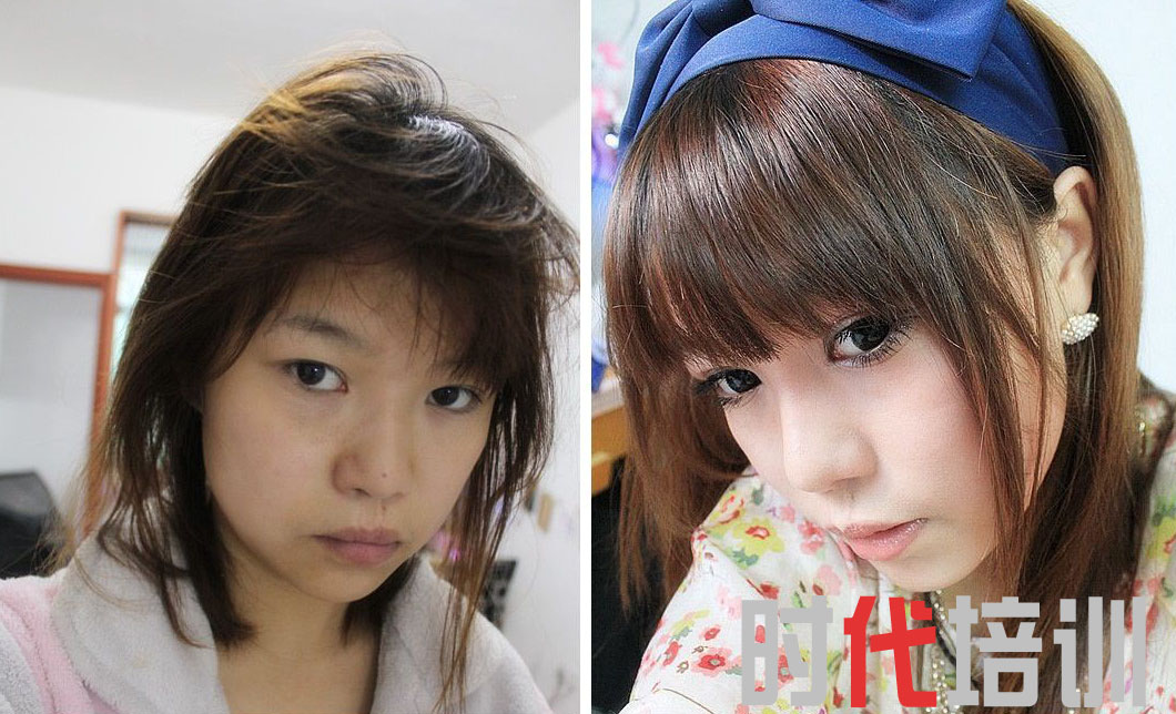俗話說世界上沒有丑女人,只有懶女人,因為只要女人不懶得化妝,都可以做一個美女。一個正確的化妝手法可以讓你提升形象氣質,有的甚至可以完全將你改變成另一個人。但如果你一點都不懂得如何化妝,只是根據自己想像,或者到化妝品店胡亂的買一些化妝品就開始嘗試著給自己化妝,那么你小心不僅沒把自己化漂亮,甚至把自己化得更丑。以前經常會在大街上看到一些中年婦女,化著一個濃妝,一看就是不懂化妝的,給人留下的只有不好的感覺。如果經常這樣,甚至會導致皮膚越來越差,到時無論你用什么面膜,什么樣的護膚品都無濟于事了。當你在糾結自己買的化妝品是不是不夠好,不斷化更多的錢換更好的化妝的品的時候,其實應該想一下,你化妝的技術問題。你可以咨詢一下專業化妝師,一點都不懂的也可以先在網上大概了解一些基礎知識,大家可以參考一下深圳時代美容化妝學校官網:正確的化妝步驟。好了,下面就帶大家來看看時代學校整理出來的女人妝前妝后的照片對比。