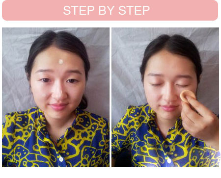 STEP 1:選擇較為輕薄的粉底液,先抹在臉頰、額頭、鼻子尖兒、下巴5點處,之后用一塊微微濕潤的海綿油內往外推均勻,然后用散粉定妝