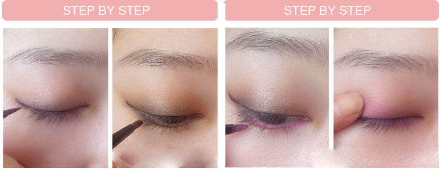 STEP 6:誰說單眼皮不適合用粉色眼影?怕顯得眼部浮腫的話,把粉色放在下眼瞼上吧,用粉色眼影或者眼線筆疊加在下眼線上,為了和下眼瞼呼應,可以用指腹把一點粉色眼影按壓在上眼瞼上,讓上眼皮有點淡淡的顏色即可。