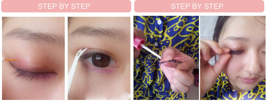 STEP 7:用雙眼皮貼總是不夠隱形,這里可以用雙眼皮膠涂抹在上眼瞼處,待眼線半透明狀后,用雙眼皮支撐叉固定于上眼瞼中間,使其平整,就可以出現自然美的雙眼皮效果哦,當然這步是可以省略的。