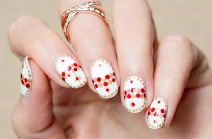 Step 4:然后用點(diǎn)鉆筆沾取紅色甲油點(diǎn)在金黃色波點(diǎn)的間隙,波點(diǎn)的大小與金黃色波點(diǎn)一致。在靠近指甲根部的位置點(diǎn)上紅色的波點(diǎn)。