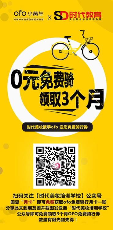 想必很多人都被ofo小黃車(chē)的“1元包月”刷爆了朋友圈,時(shí)代作為國(guó)內(nèi)知名的美妝職業(yè)培訓(xùn)學(xué)校,攜手ofo送你免費(fèi)騎車(chē)卷,不用再每天擠著擁堵公交幾個(gè)小時(shí),低碳環(huán)保,沿途的風(fēng)景也任你欣賞,好啦!小編也不廢話了,大家也已經(jīng)迫不及待了。